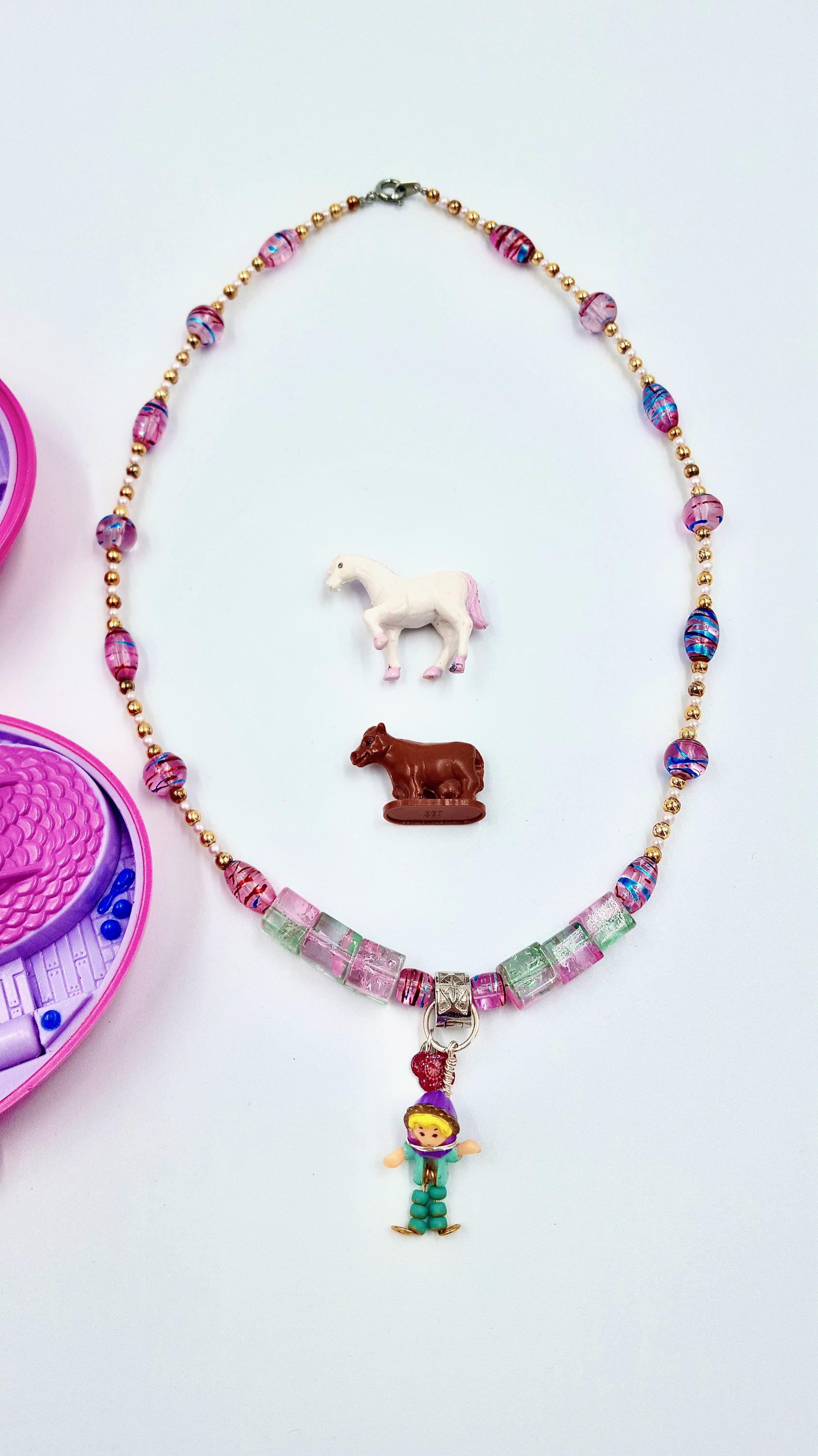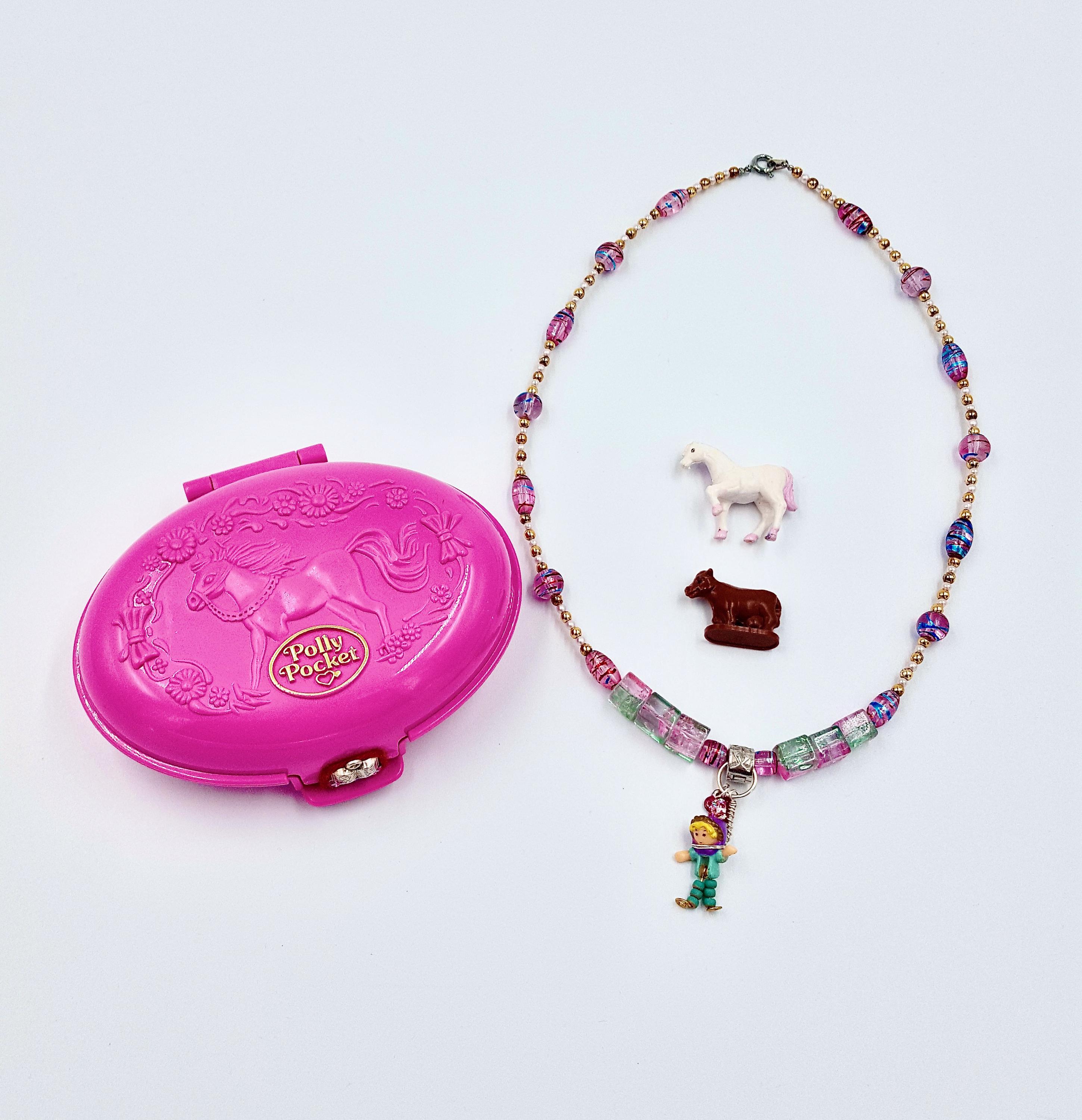 -Comes with 1 White/Pink Trendmasters Horse Figure, 1 Polly Pocket Cow Figure and Polly Pocket Palomino Pony Play Set Doll Pendant Beaded Necklace