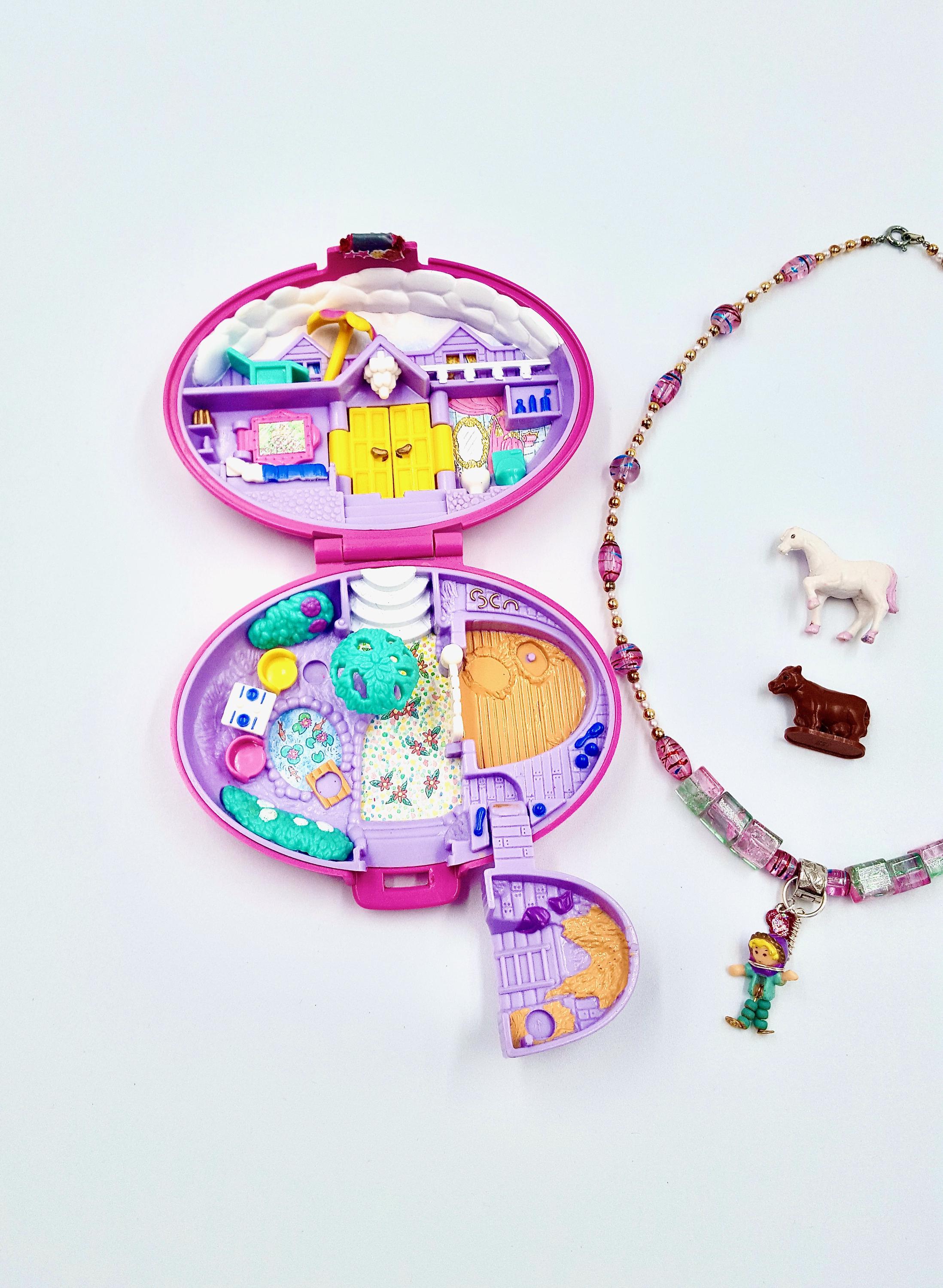 1995 Polly Pocket Palomino Pony Play Set with Doll Pendant Beaded Necklace, Horse and Cow Figures!