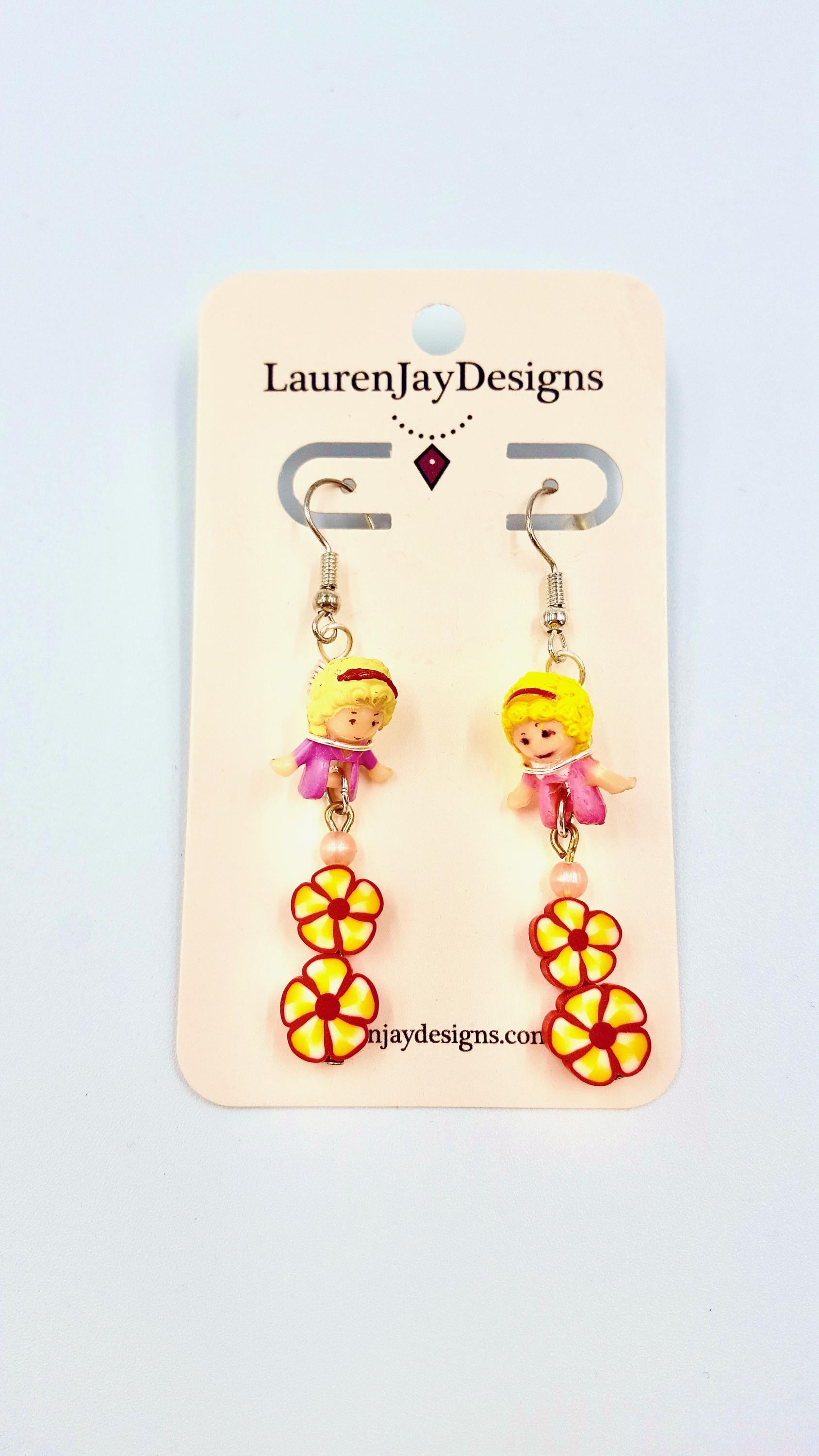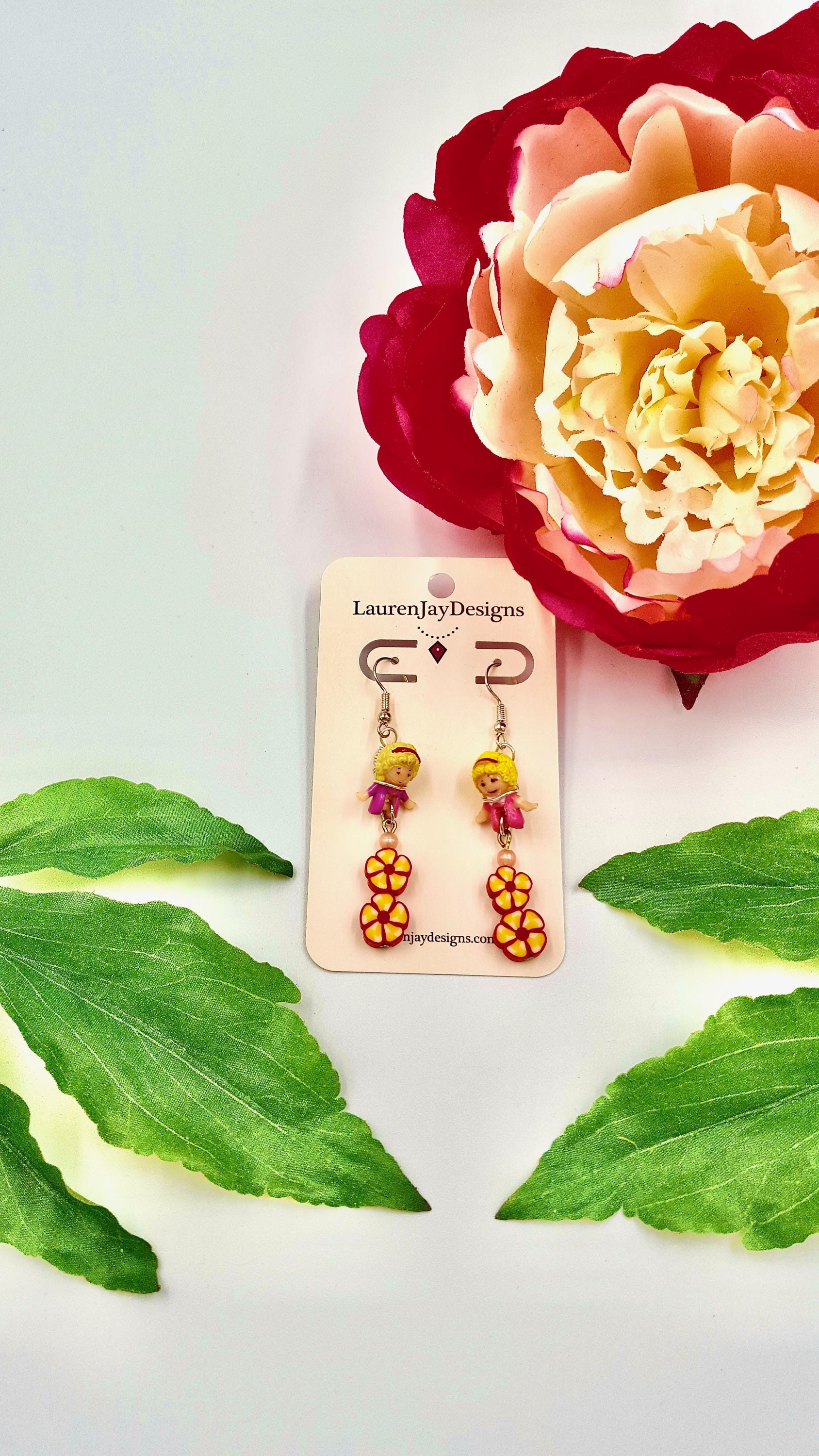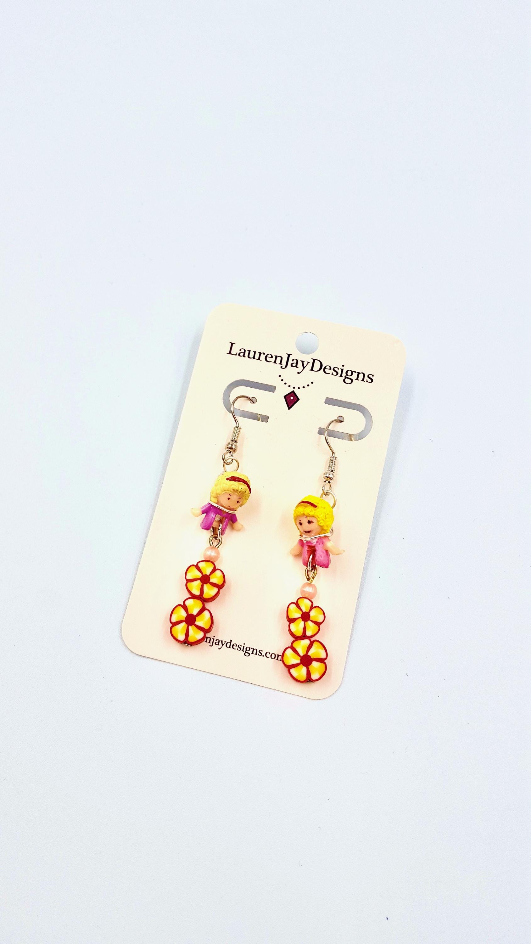 Polly Pocket Pink Doll Red and Yellow Flower Dangle Earrings by Lauren Jay Designs!