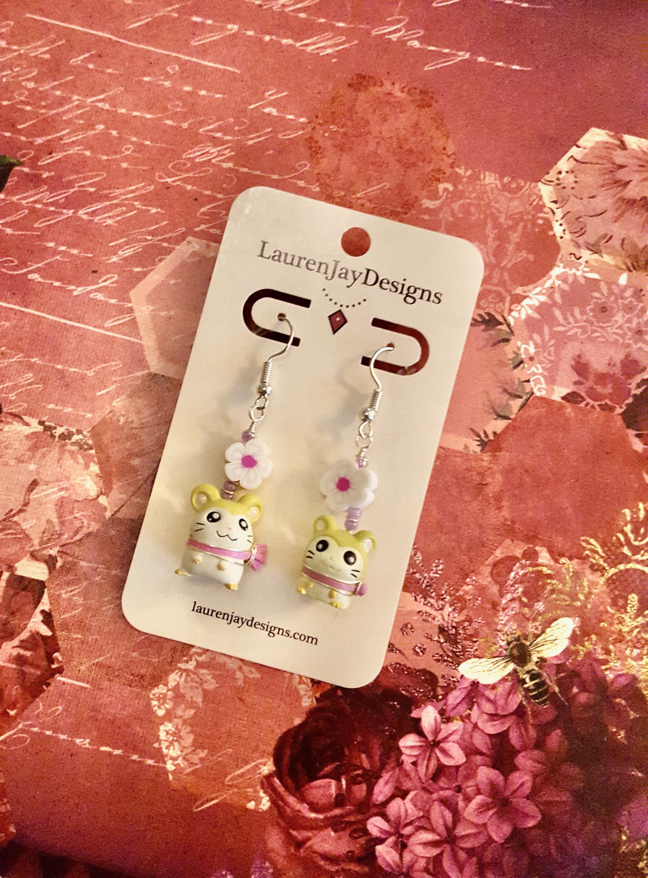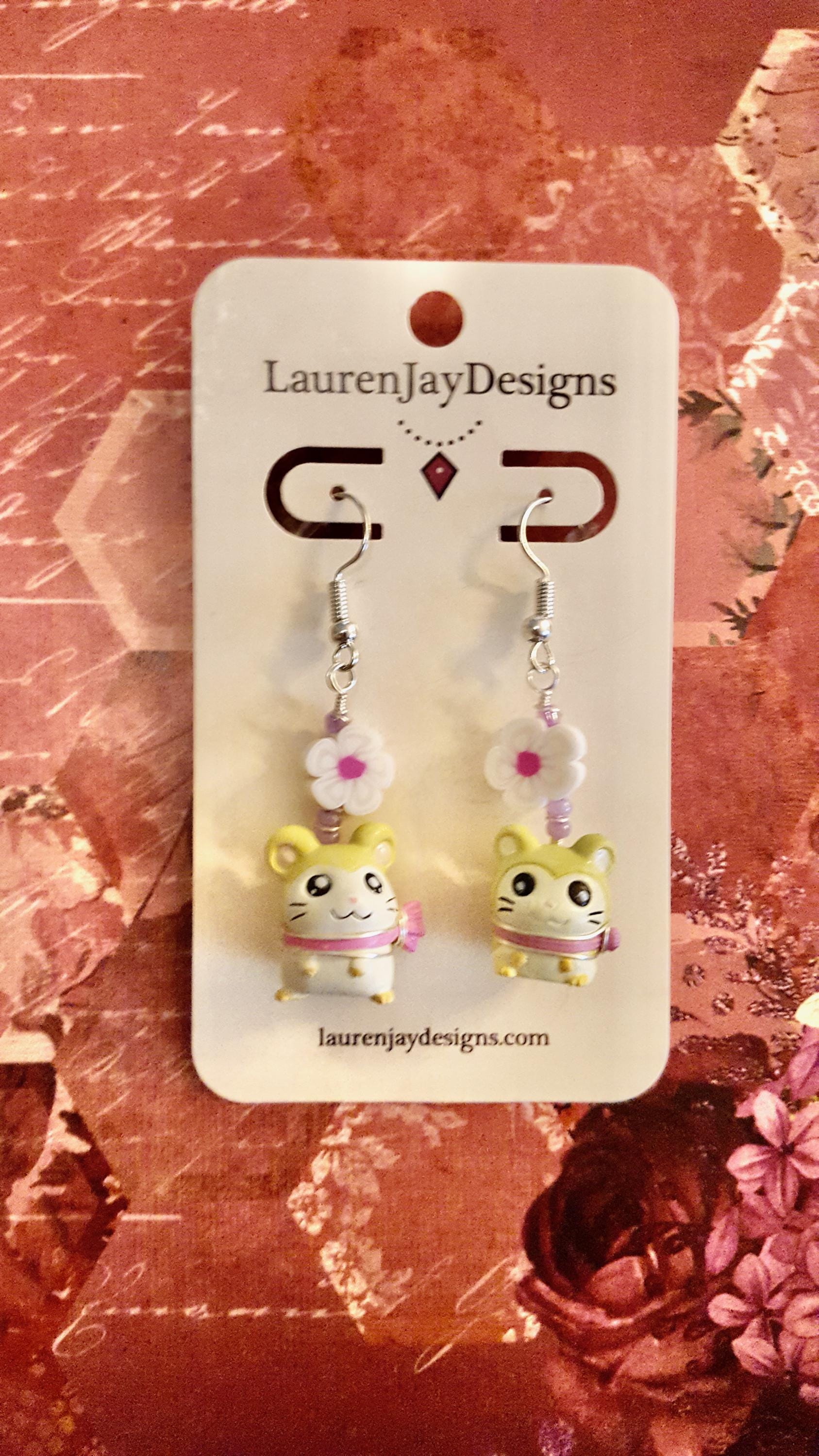 Hamtaro Pashmina Hamster Pendant White Flower Pink Beaded Dangle Earrings by Lauren Jay Designs!