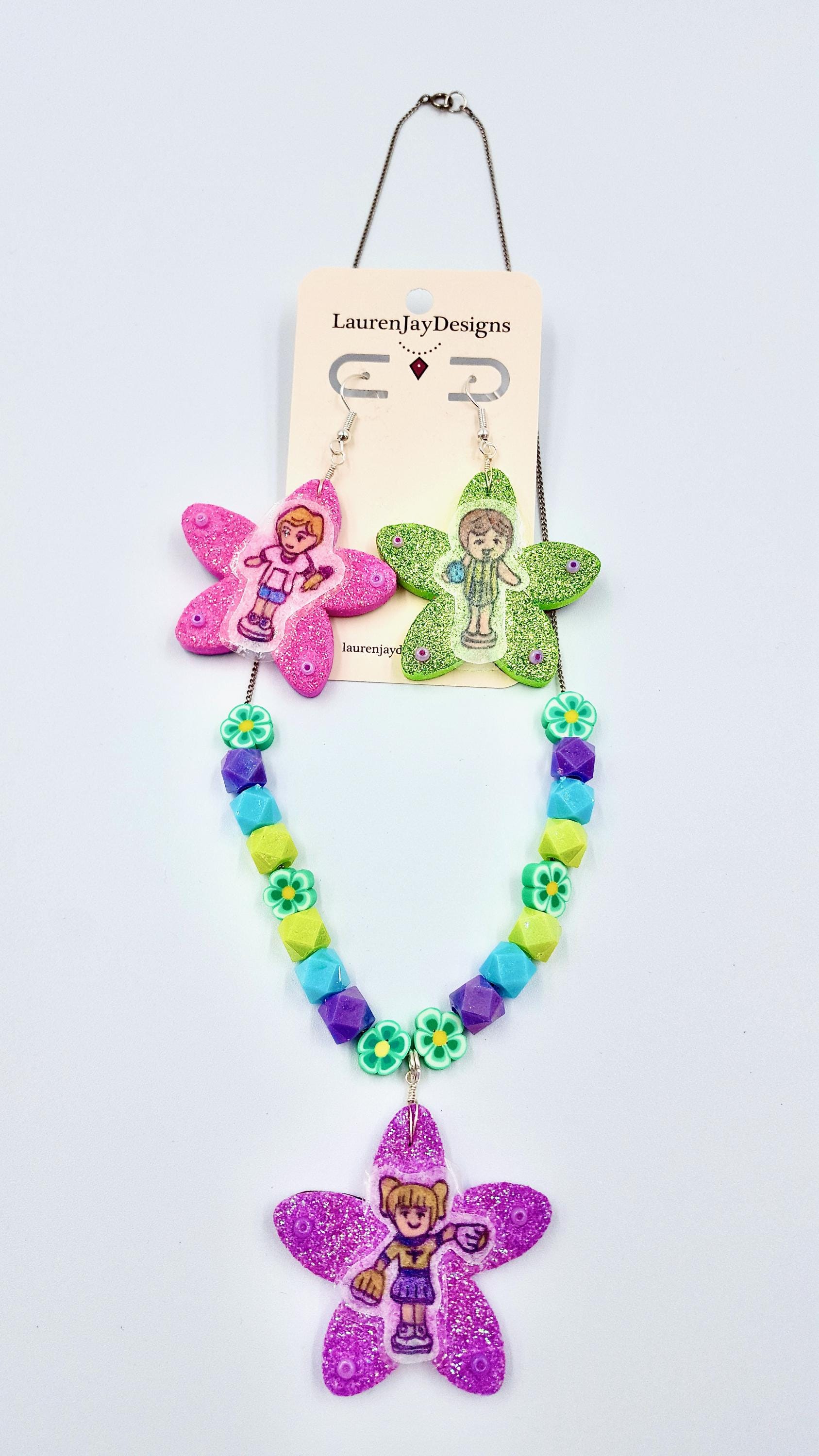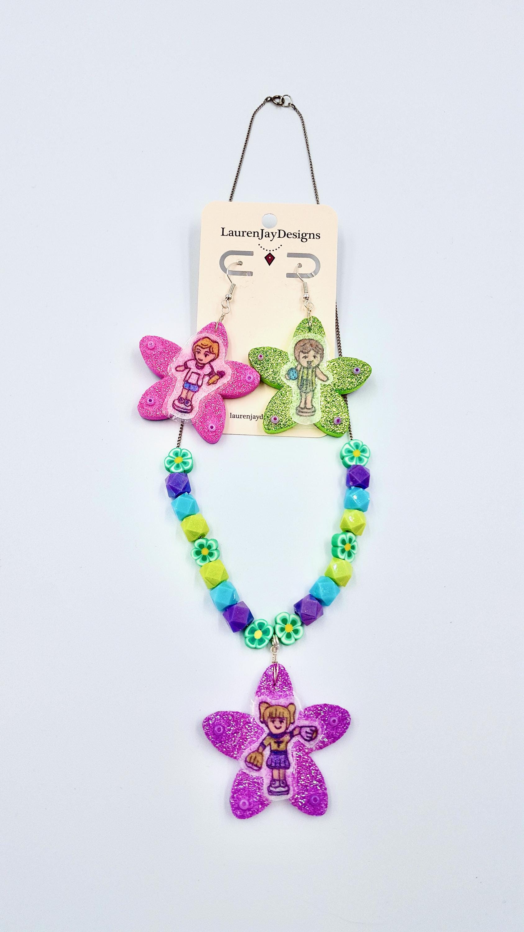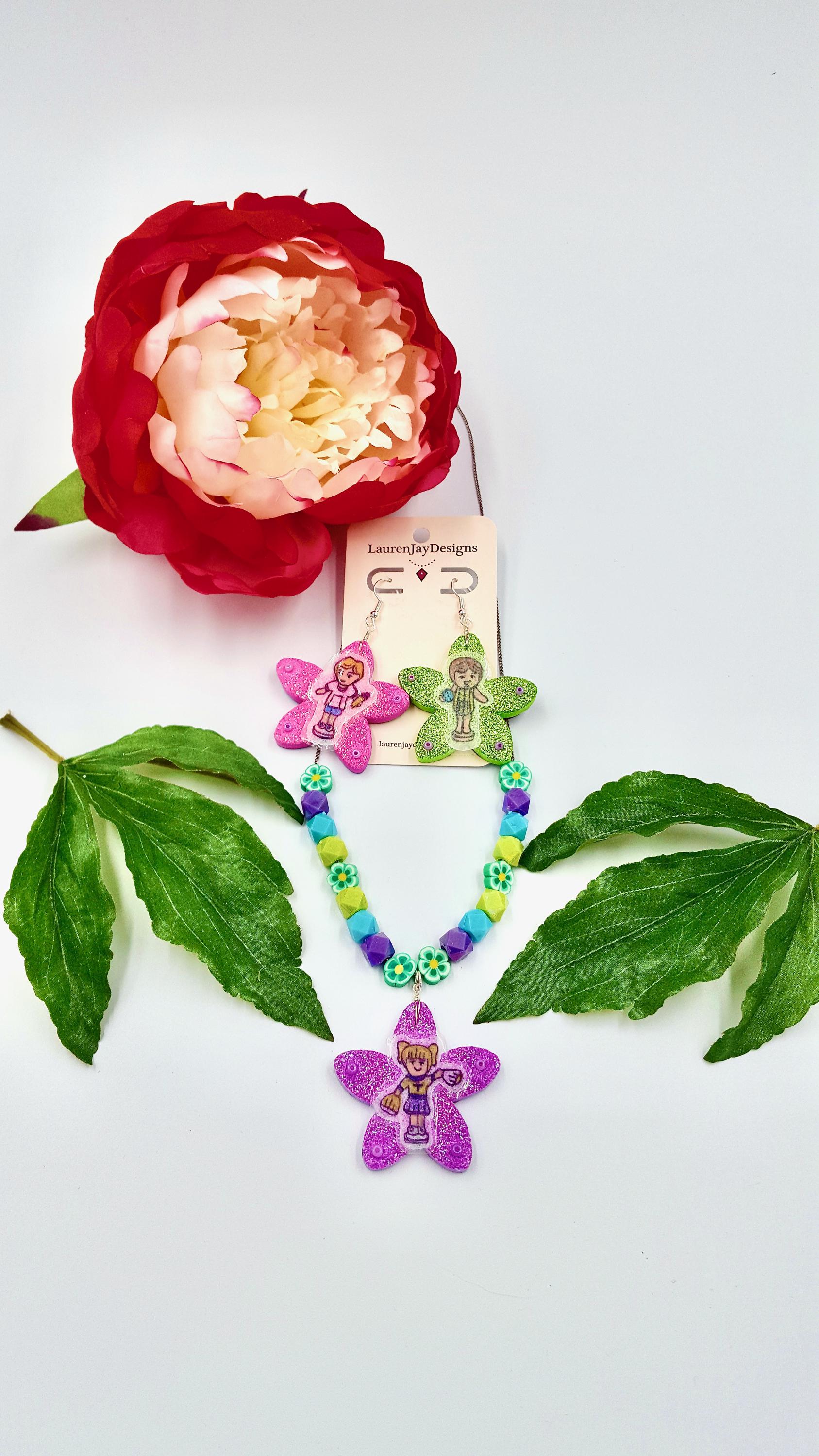 Polly Pocket Sparkle Flower Dangle Earrings and Beaded Chain Necklace Jewellery Set by Lauren Jay Designs!