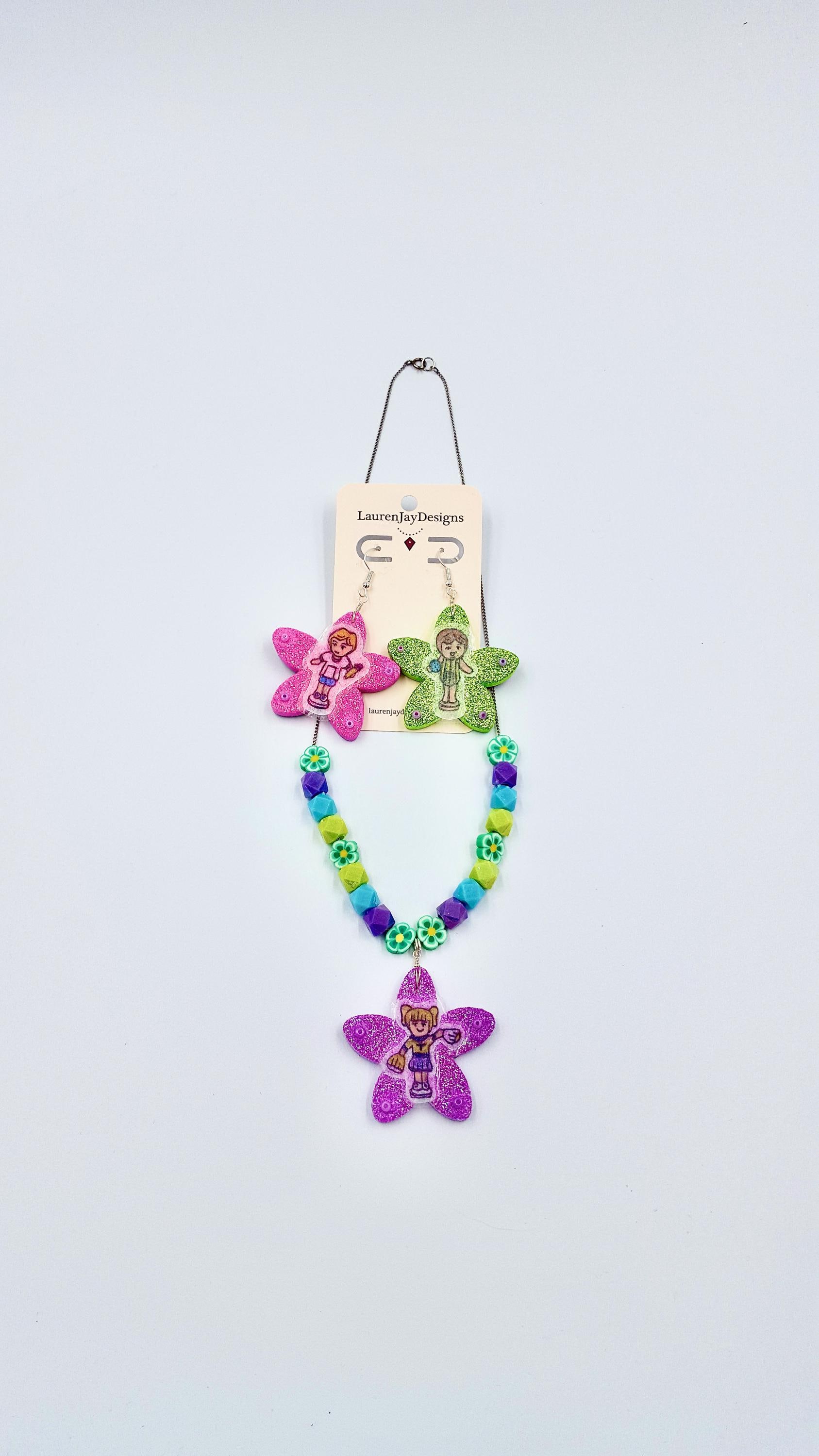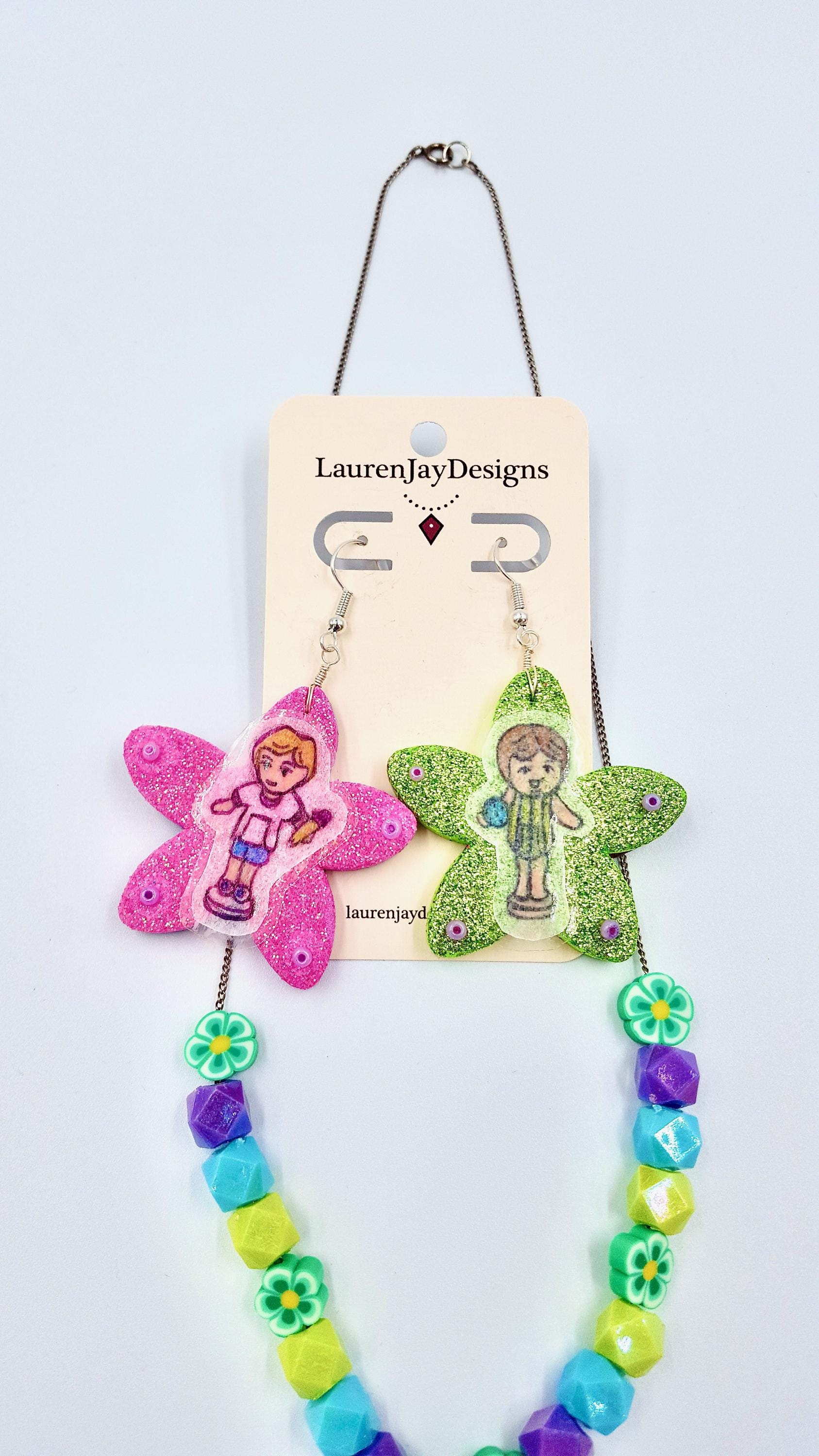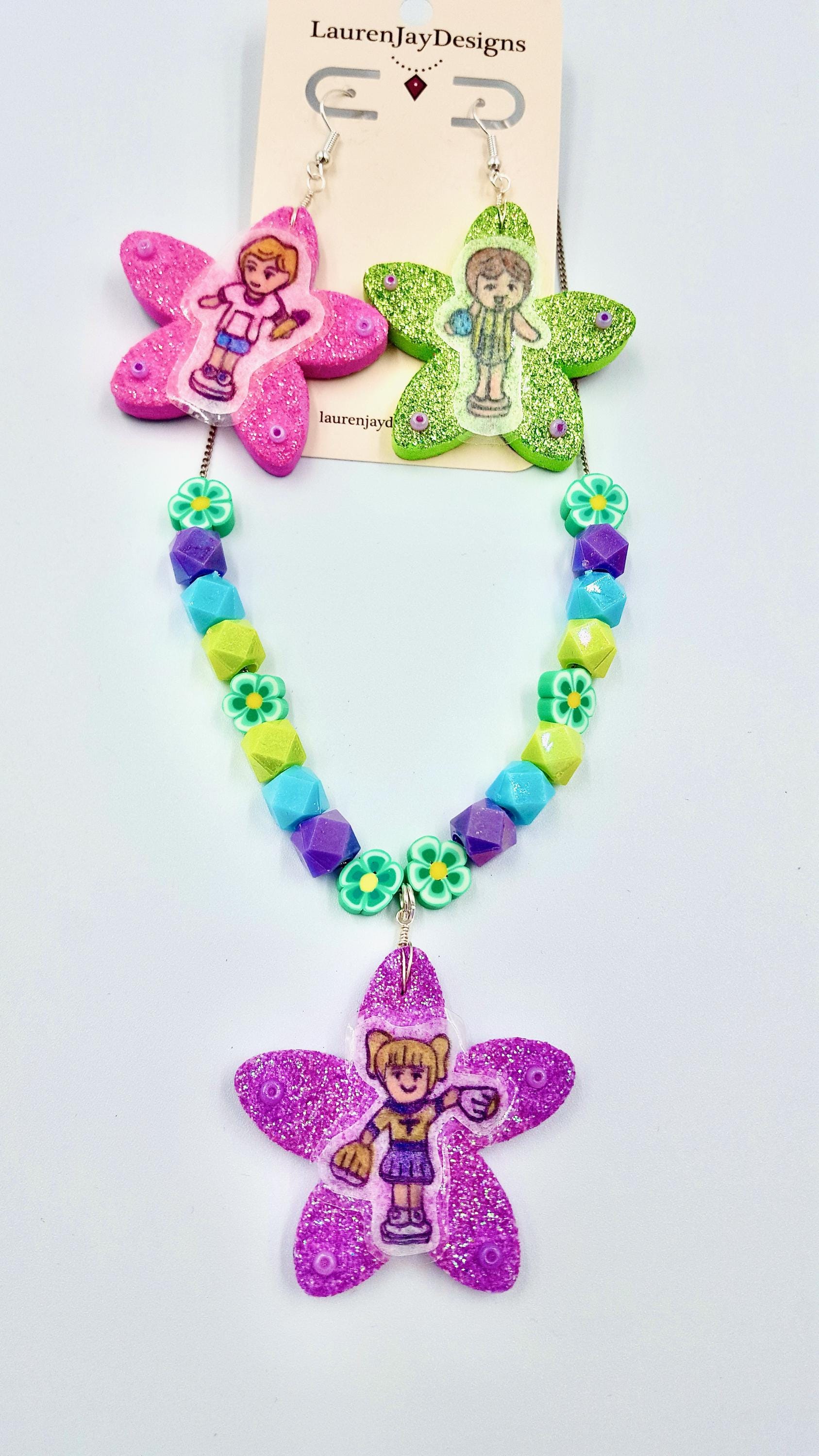 Polly Pocket Sparkle Flower Dangle Earrings and Beaded Chain Necklace Jewellery Set by Lauren Jay Designs!