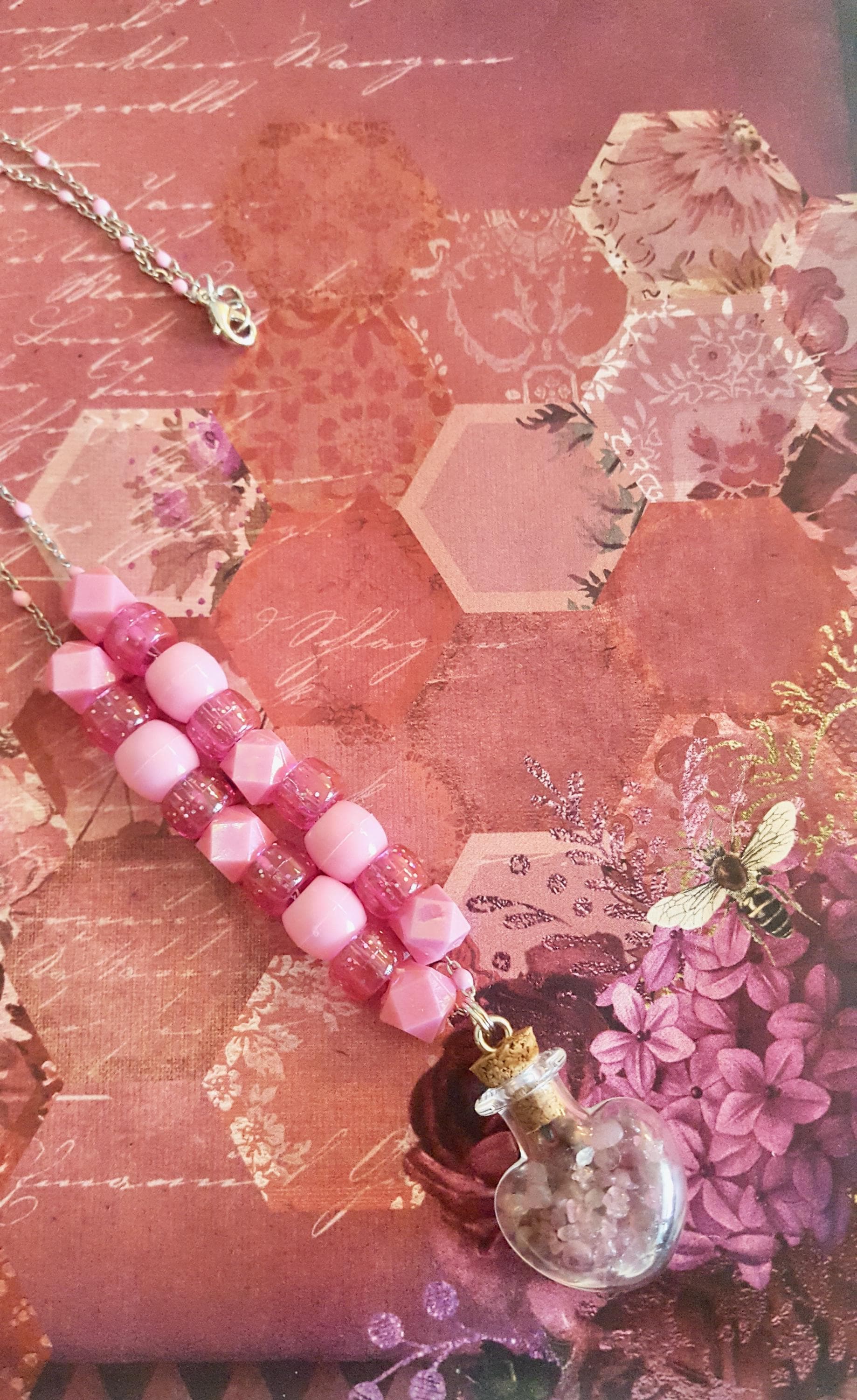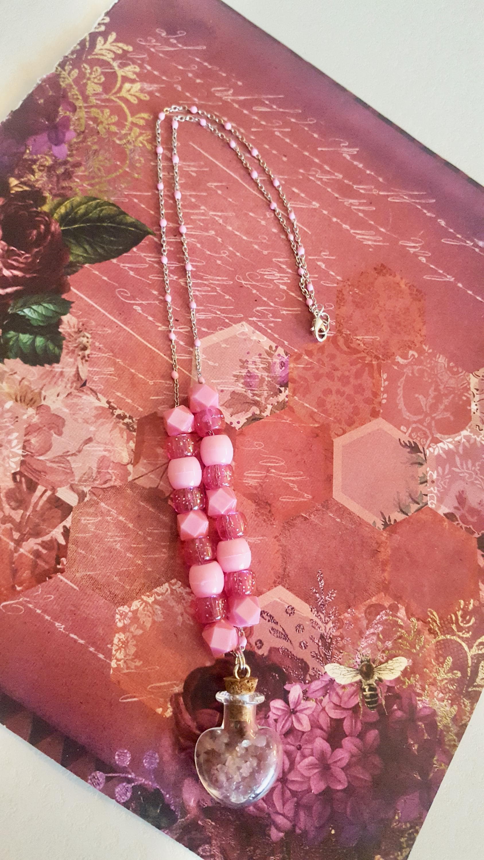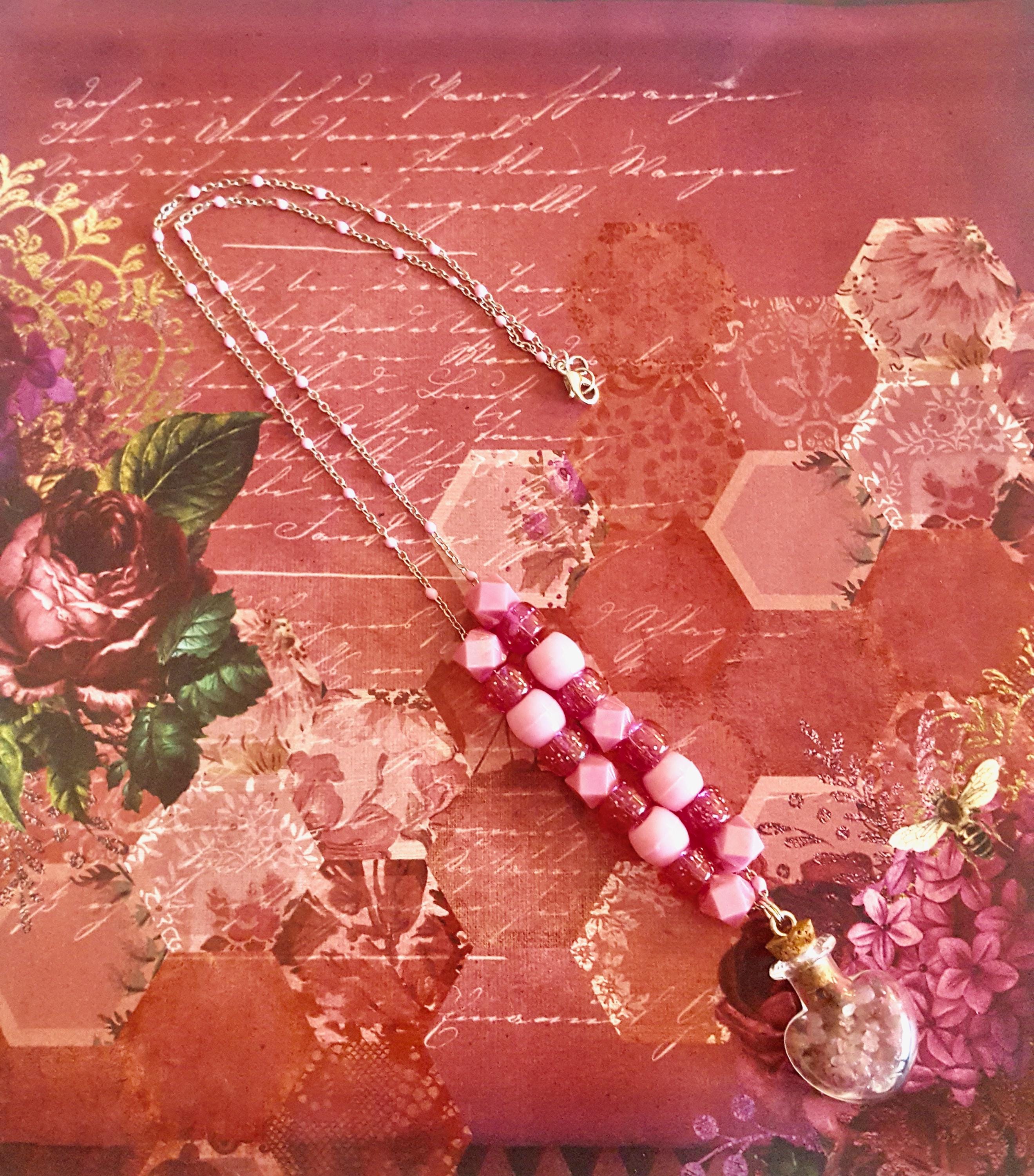 Glass Heart Jar Pendant with Pink Sea Glass Pebbles on Pink Beaded Chain Necklace by Lauren Jay Designs!