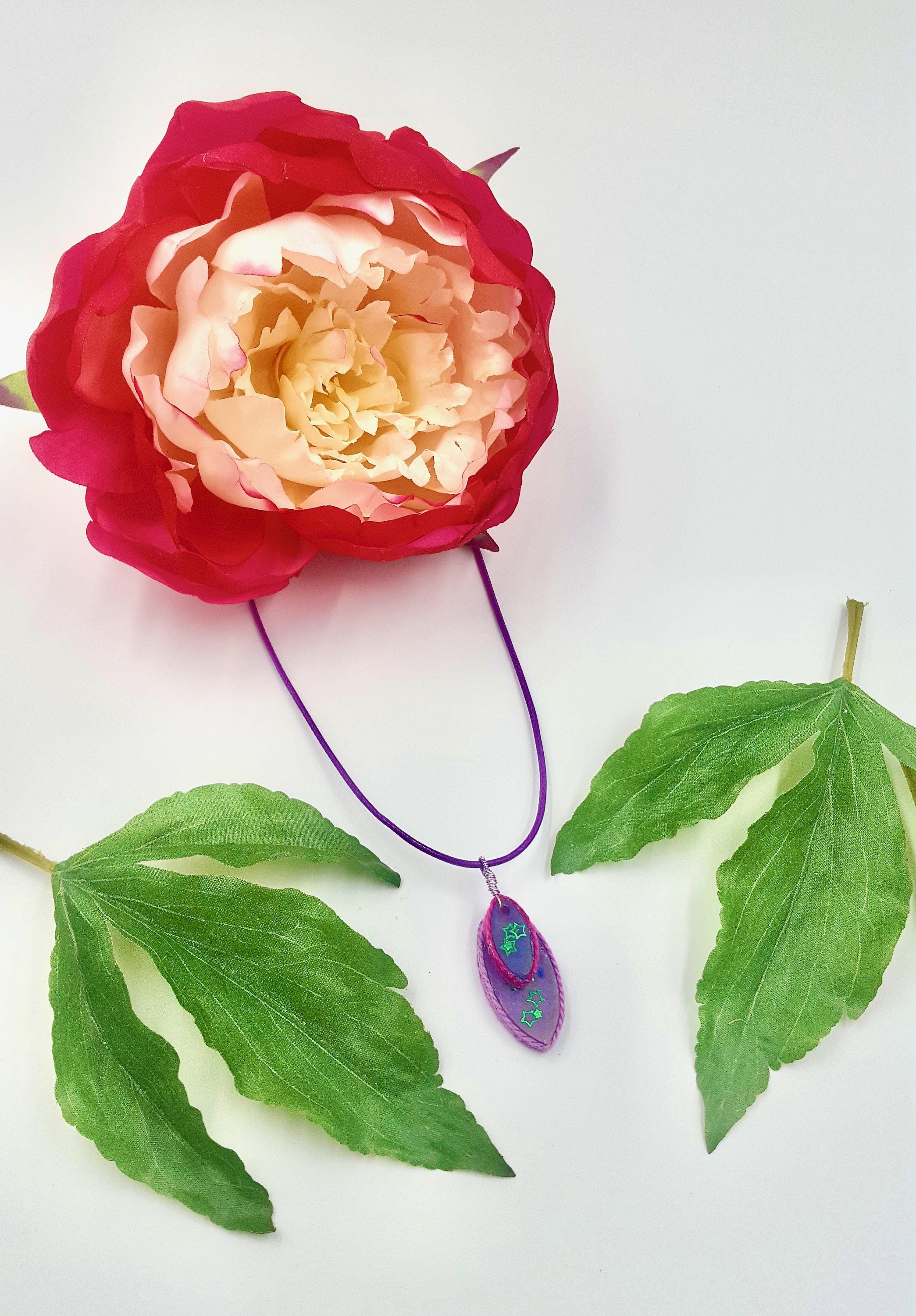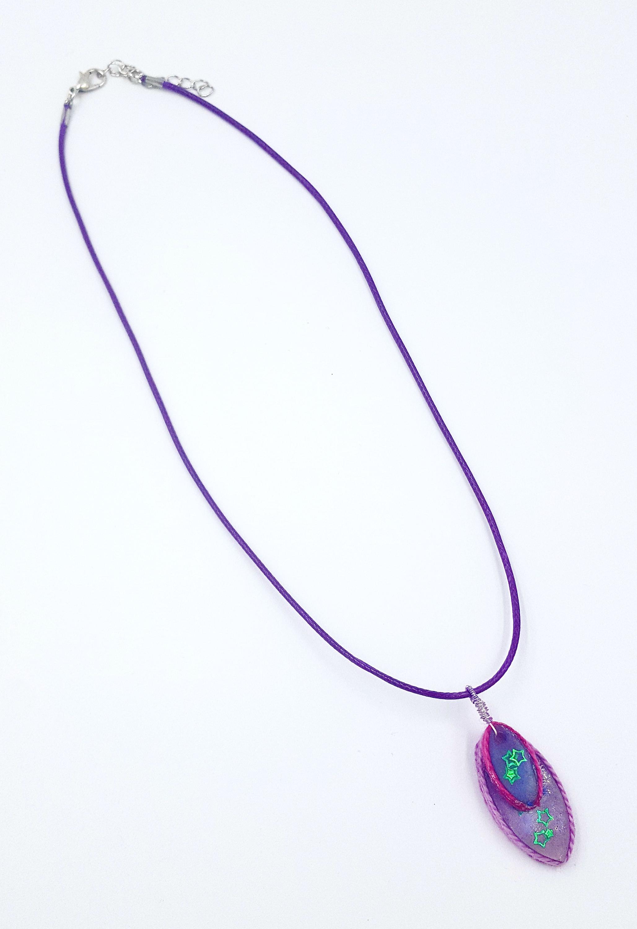 Purple Resin Green Star Sparkle Cat Eye Shaped Pendant With Purple Border on Purple Cord Necklace by Lauren Jay Designs!