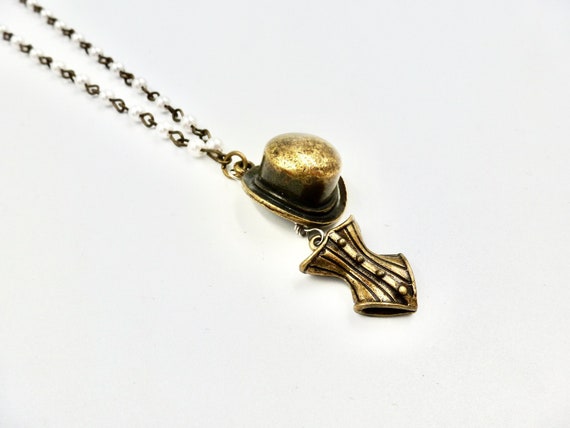 Bustier and Top Hat Burlesque Style Pendant Pearl Beaded Chain Necklace by Lauren Jay Designs